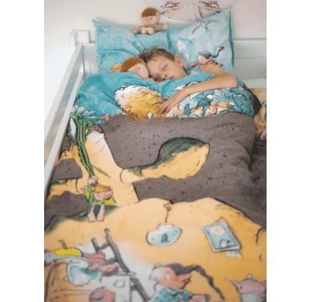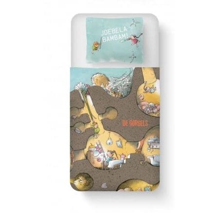 De kleine Gorgels komen uit de bekende boeken van Jochem Myjer. Dit zijn wezentjes die speciaal getraind zijn om kinderen te beschermen tegen Brutelaars. Op het Gorgelholletjes dekbedovertrek zie je wat de Gorgels allemaal uitspoken in hun eigen plekje. Het kleurrijke overtrek ziet er vrolijk uit in de kinderkamer. Op de bijpassende kussensloop zijn twee Gorgels te zien met de bekende uitspraak Joebelabambam! Voorlezen voor het slapen gaan wordt nu nog leuker met het Gorgels dekbedovertrek.Het Gorgelholletjes overtrek is vervaardigd uit 100% katoen, een zachte en soepele stof. Katoen is een erg fijne stof voor beddengoed, omdat het luchtig en koel aanvoelt. Aan de onderzijde heeft het Gorgels overtrek een dubbel doorlopende instopstrook. Hierdoor past het dekbed er gemakkelijk in.